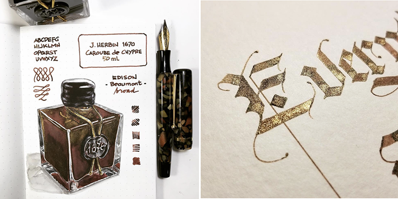 Just like with dip pens, more color diversity will be achieved with juicier, larger nibs that have a good flow (flex or broad nib fountain pens). Small nibs will still work, but less color diversity will be produced and it will be easier for ink flow to become restricted and harder to clean out your fountain pen. In general, fountain pen users should be more diligent about pen maintenance and cleaning when it comes to J. Herbin 1670 inks. While this ink is formulated to be used in fountain pens, its high saturation and gold flakes make cleaning more necessary, and in some cases, more difficult.